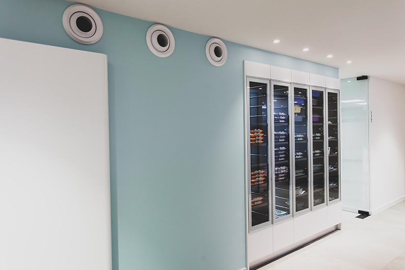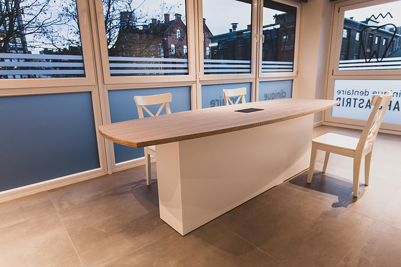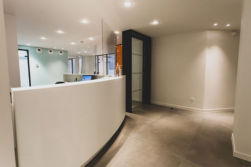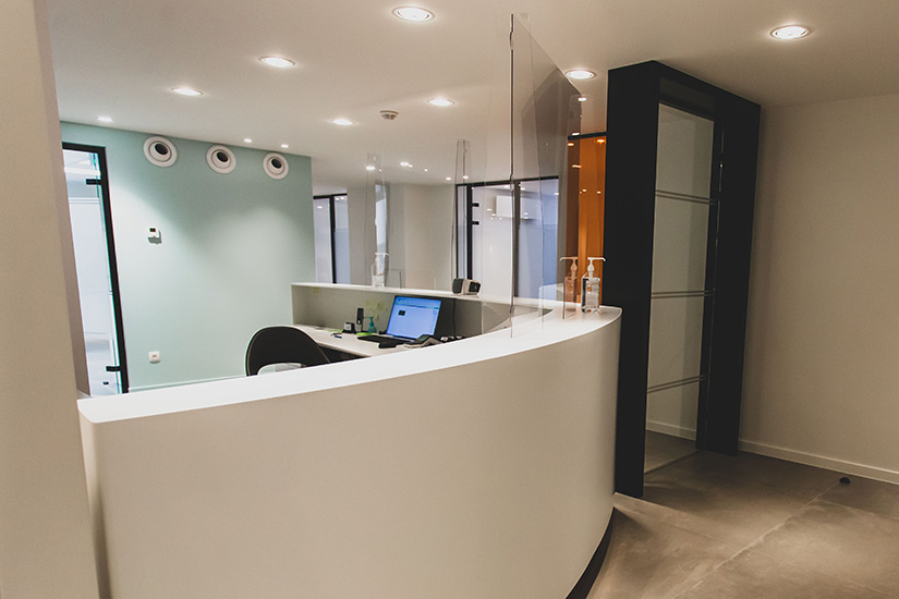 - Comptoir d’accueil cintré en aile d’avion entièrement en corian