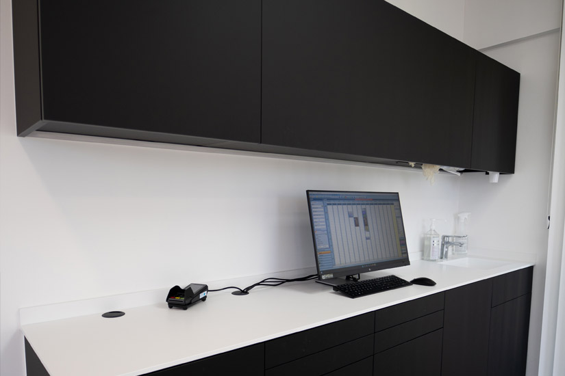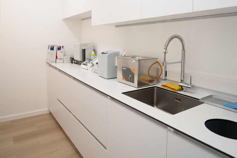 - Plan de travail de la salle de stérilisation en Trespa avec découpe poubelle