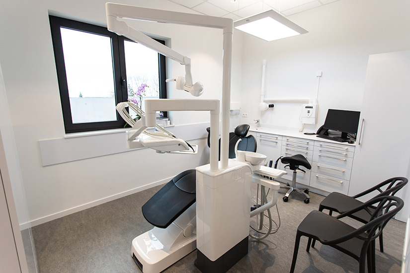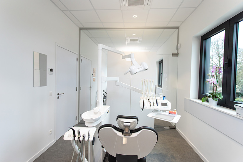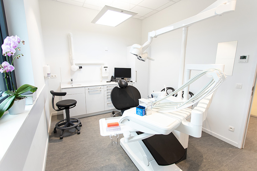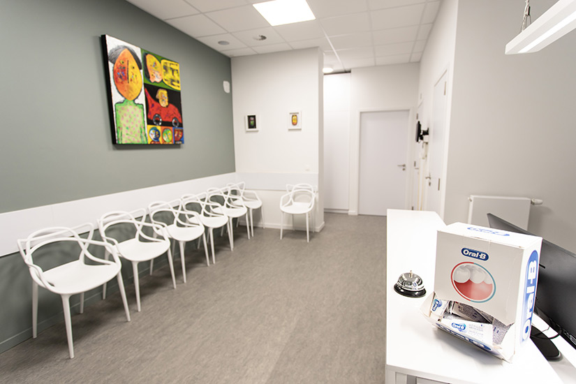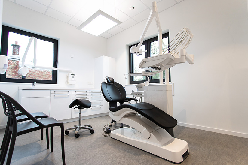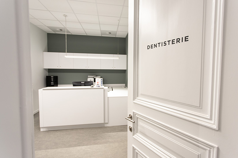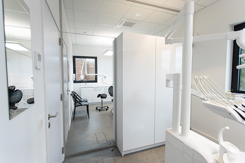 La clinique dentaire a la particularité d’avoir deux salles de soins séparées par une cloison entièrement vitrée au milieu de laquelle nous avons intégré un meuble accessible des deux côtés.