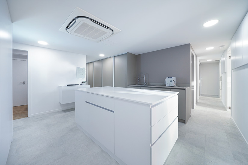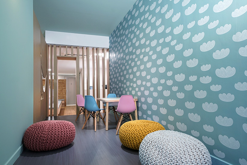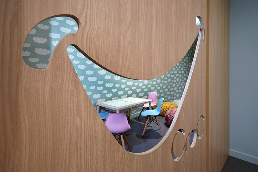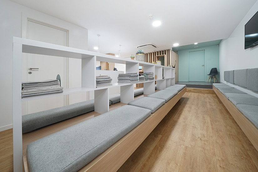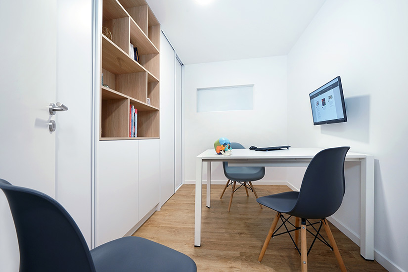 - Une salle d’attente sur mesure avec une bibliothèque intégrée.