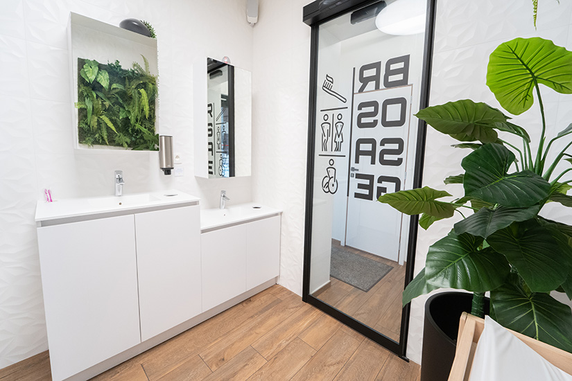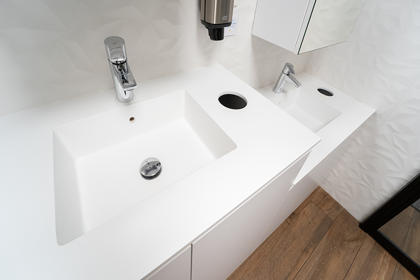 - Un coin brossage sur deux niveaux pour faciliter l’accès aux enfants : un côté pour les adultes et un côté plus bas pour les enfants