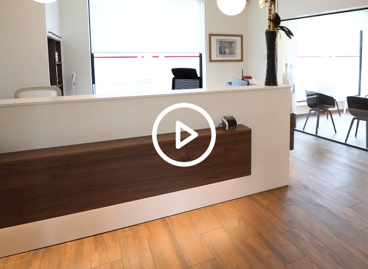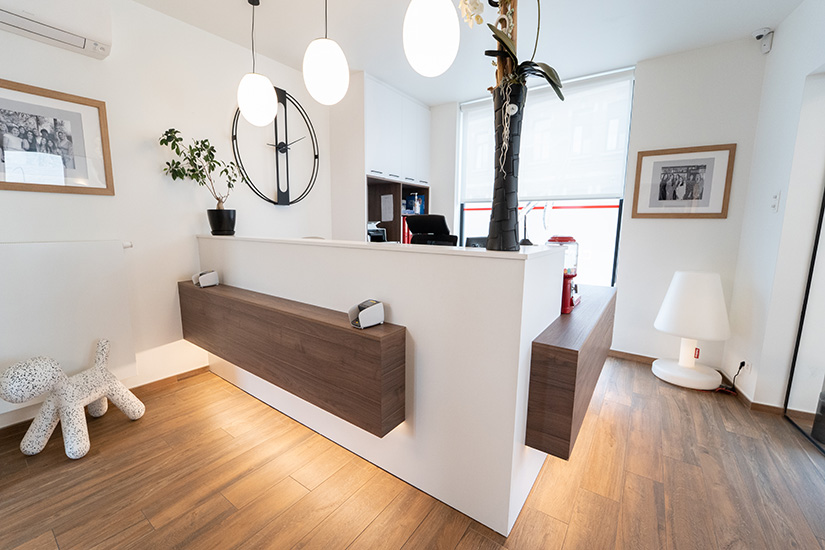 - Un comptoir d’accueil sur mesure en noyer avec éclairage LED indirect placé sur la partie inférieure du meuble pour souligner son design