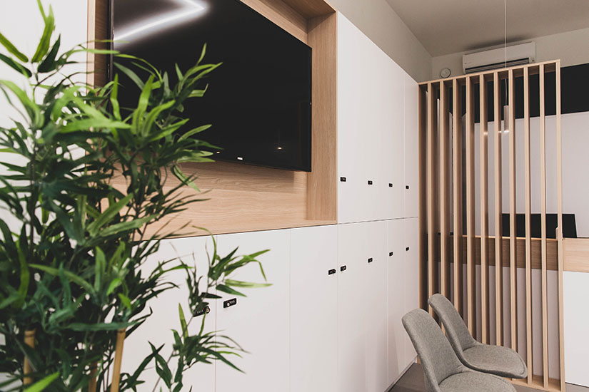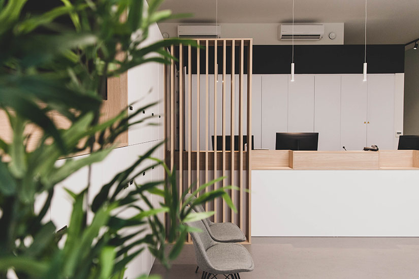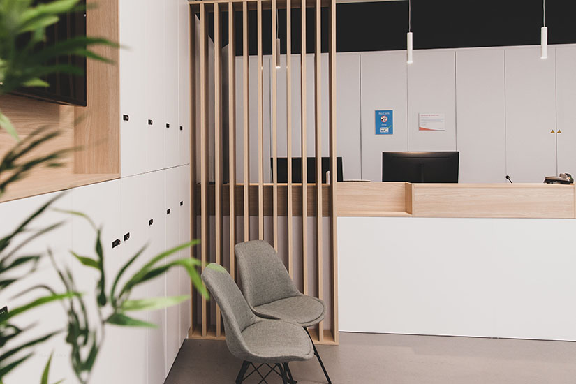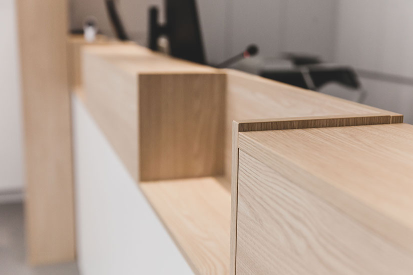 - Comptoir d’accueil avec une cloison lattée en chêne