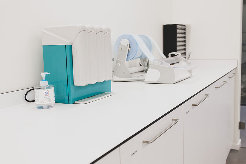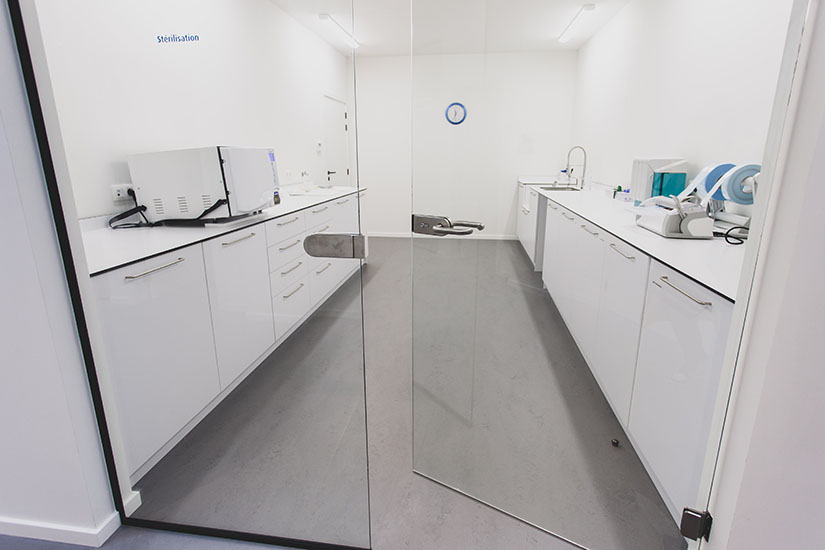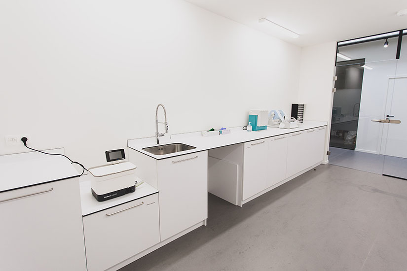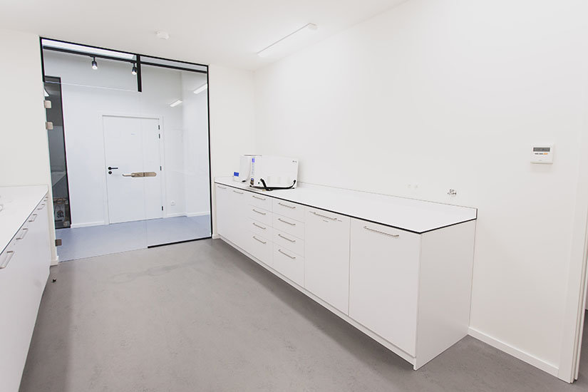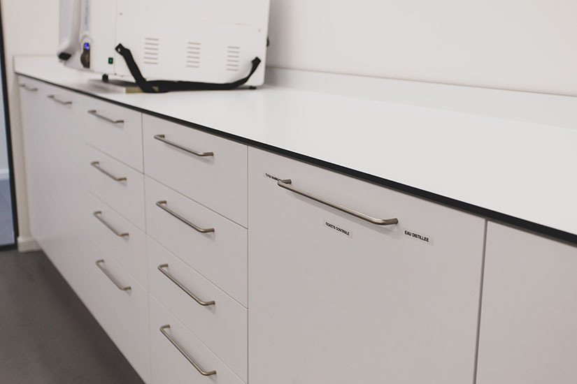 - Plan de travail de la salle de stérilisation en Trespa avec découpe poubelle